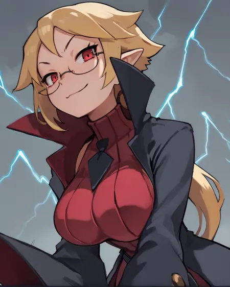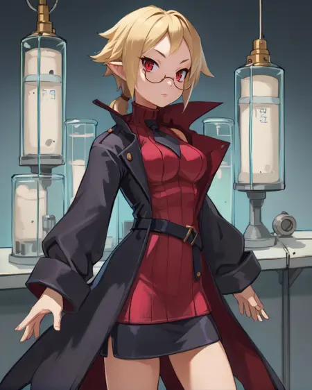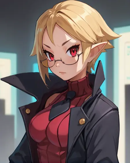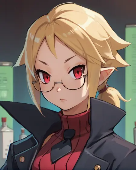Professor, red eyes, short blonde hair, low ponytail, or ponytail - pointy ears,