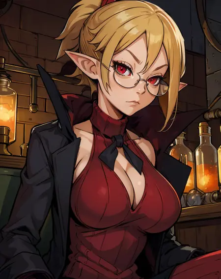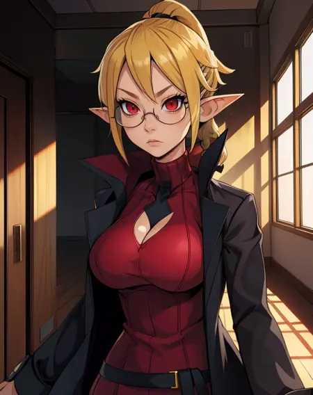 教授、 赤い目、短い金髪、低いポニーテール、またはポニーテール、尖った耳、