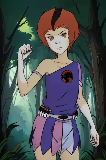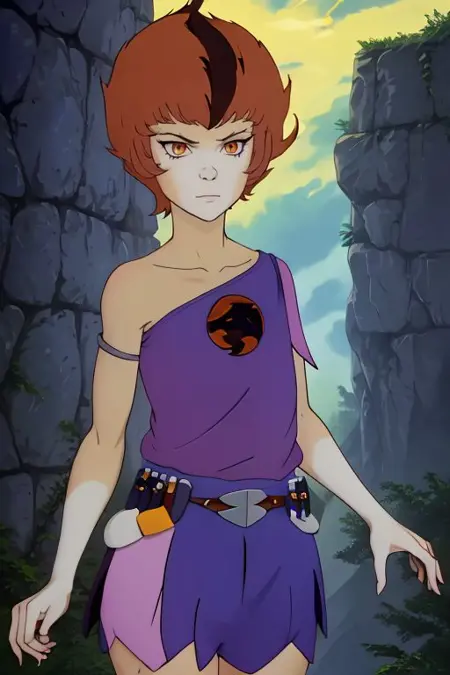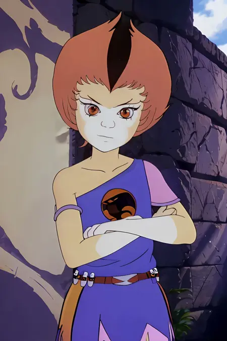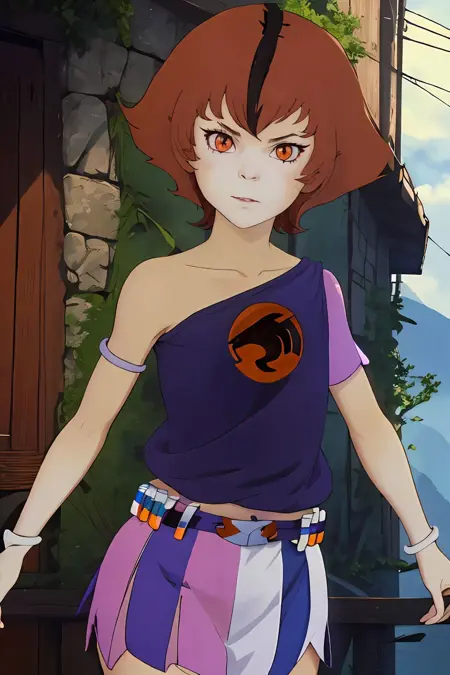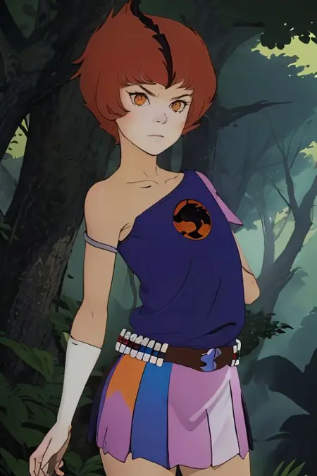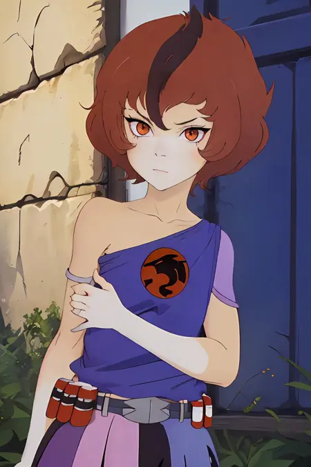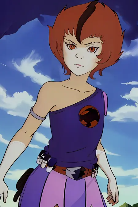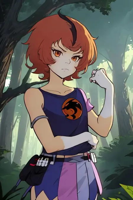 blue tank top, multicolored skirt, one shoulder out, eye of thundera, utility belt, silver armlet