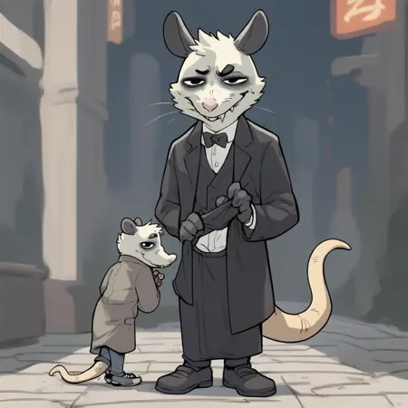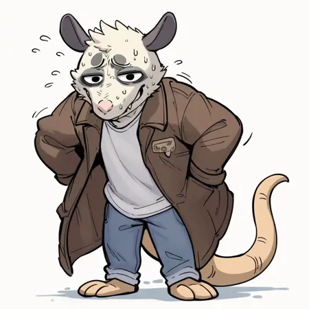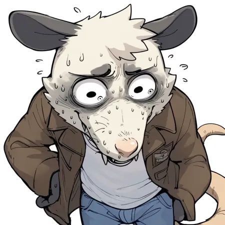 Anthro, Possum, American opossum, white fur, black ears, black eyes, pink nose, fangs, hairless tail,