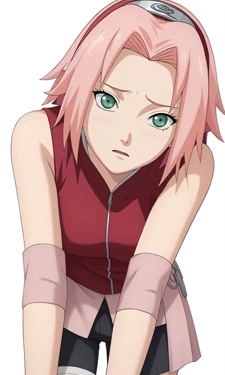 harunosakura, 1girl, ピンクの髪, 緑の目, 短髪, 黒の手袋, 肘ガード, シャツなし, 視線を観察者に向けた, ピンクのスカート, 額当て, 包帯を巻いた足, 黒のショートパンツ, コノハガクレのマーク, 赤いシャツ,