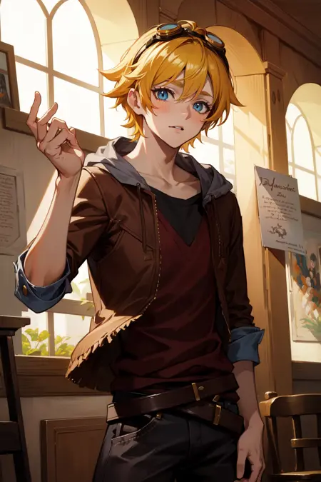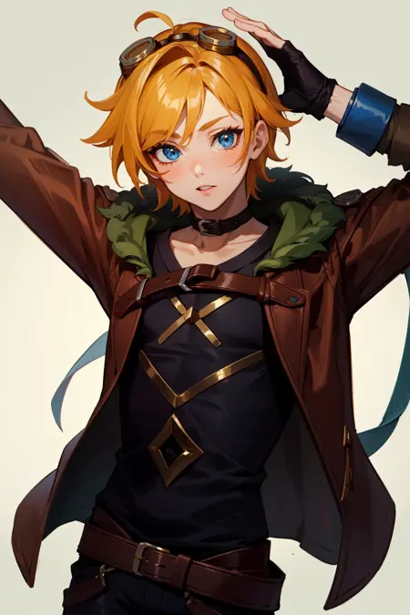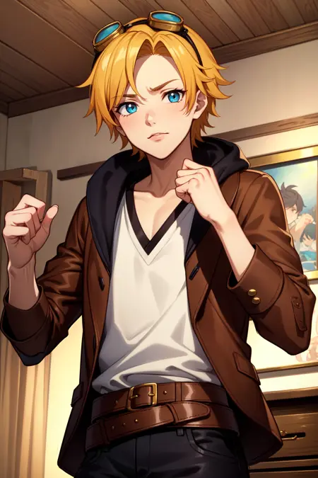 デフォルトのエズリアル: ezreal, 1boy, 茶色のジャケット, ゴーグルを頭に, ベルト
