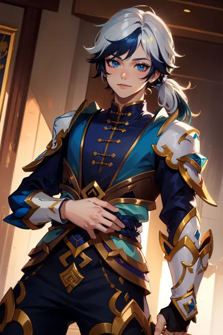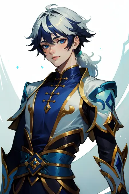 磁器プロテクター エズリアル: porcelain protector ezreal, 1boy, 中国風の服, 多色の髪, 白髪, 青髪, 短いポニーテール
