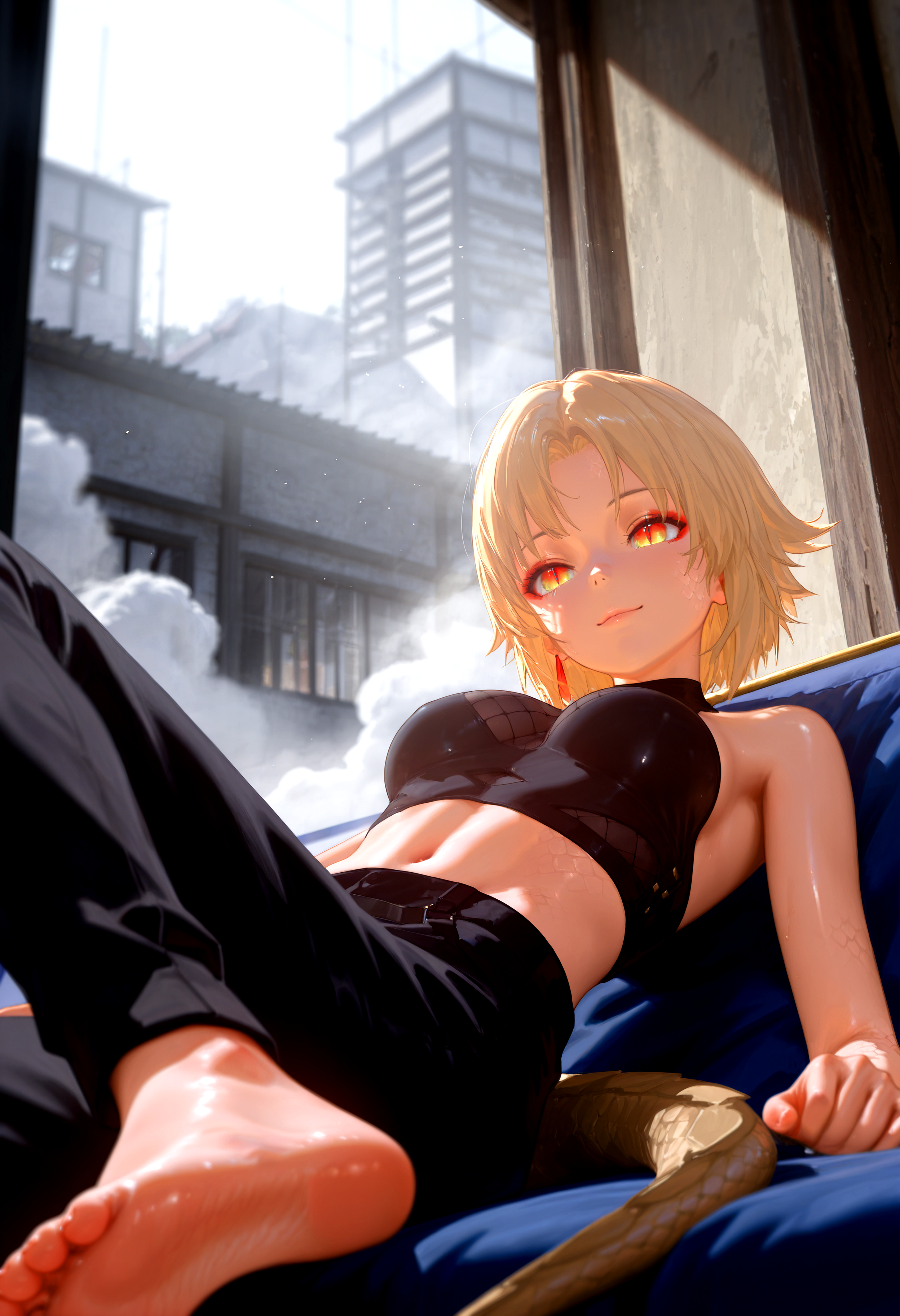 crop top, sleeveless, bare shoulders, clothing cutout, cleavage, midriff, strapless, fishnets, black pants, fingerless gloves, toeless footwear,