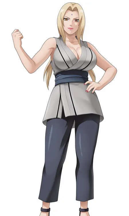 tsu, 1girl, tsunade (naruto), looking at viewer, blonde hair, low twintails, forehead mark, brown eyes, breasts, grey kimono, blue pants, sleeveless kimono,