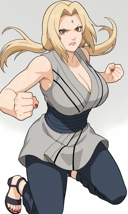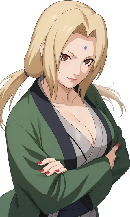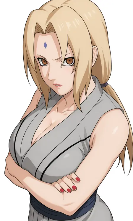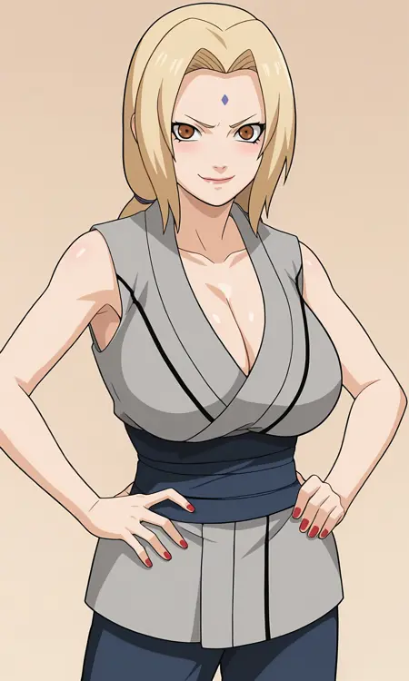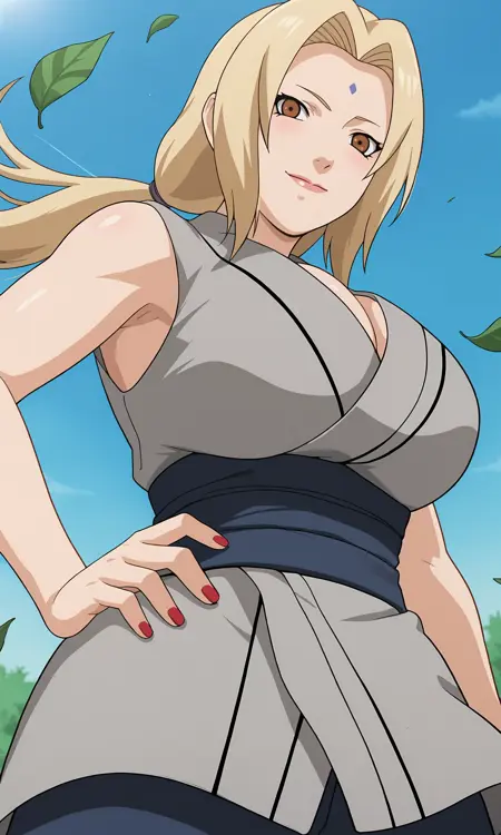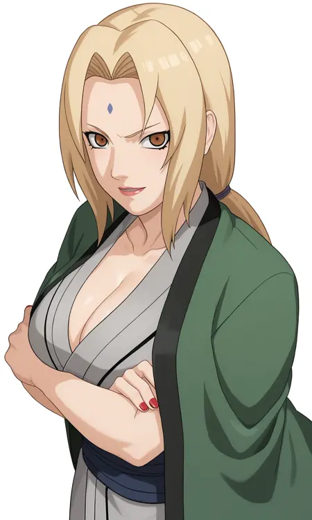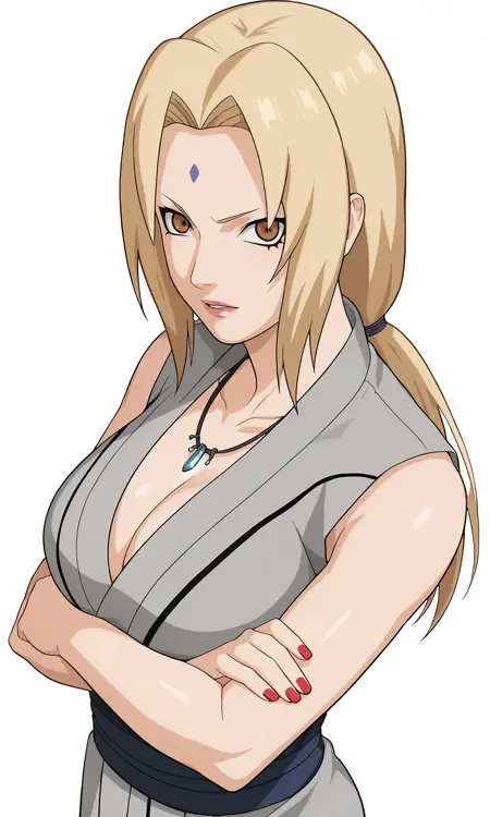 tsu, 1girl, tsunade (naruto), looking at viewer, blonde hair, low twintails, forehead mark, brown eyes, breasts, grey kimono, blue pants, sleeveless kimono,