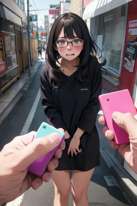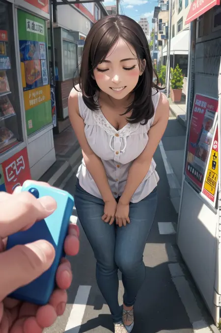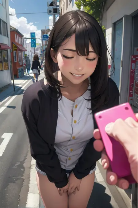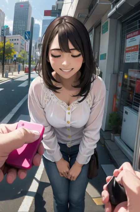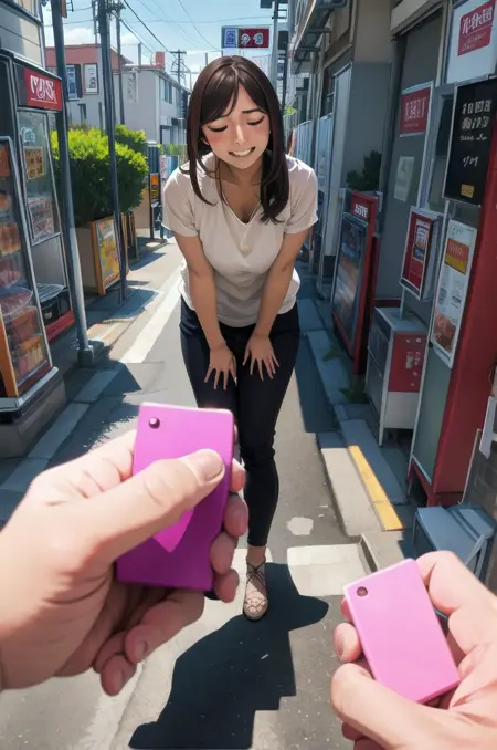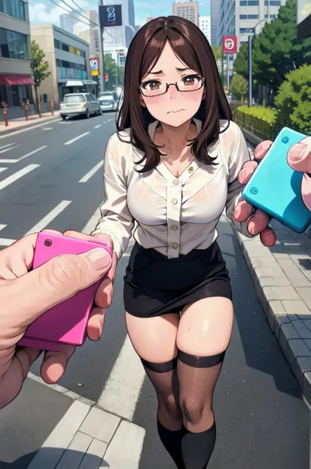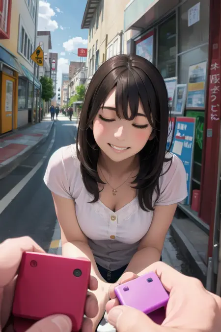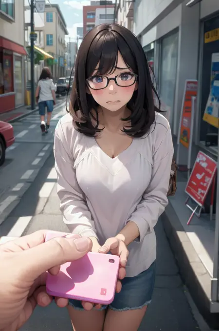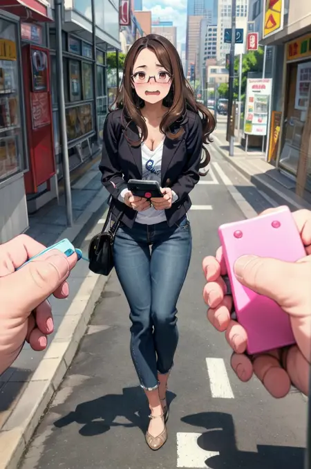 masterpiece, best quality, ultra-detailed, illustration, remote controller, remote control, 1girl, glasses, solo, brown hair, long hair, laughing, holding, pov, street, road, city, <lora:remocon_1_MID5_ResizeDIM32:1>