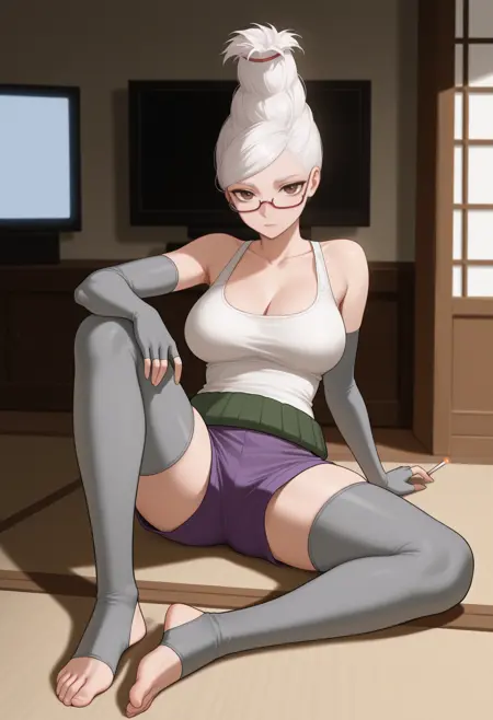 Trigger + Appearance: se1ko, mature female, white hair, updo, brown eyes, glasses, red-framed eyewear, large breasts