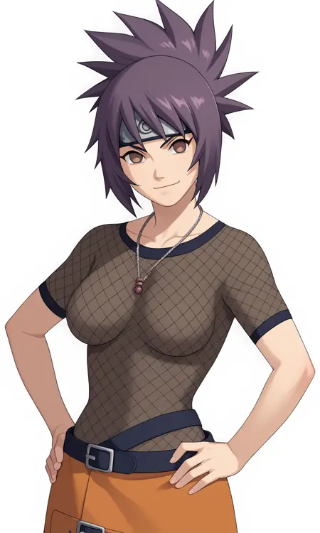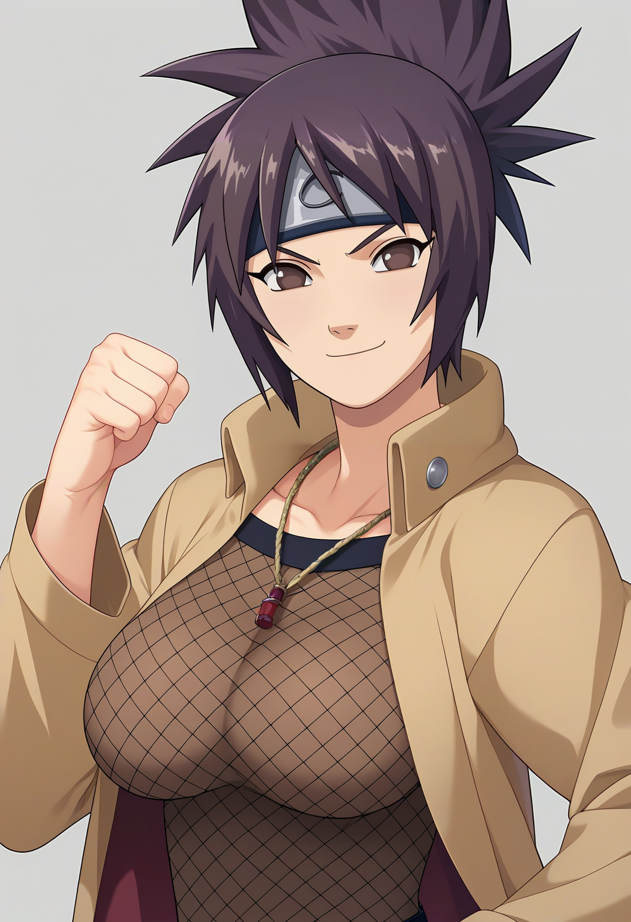 ankomitarashire, 1girl, solo, looking at viewer, brown eyes, purple hair, ponytail, forehead protector, konohagakure symbol,