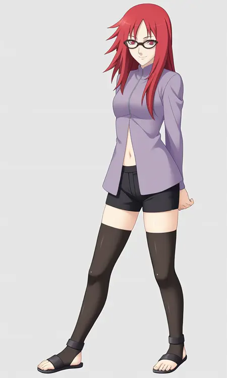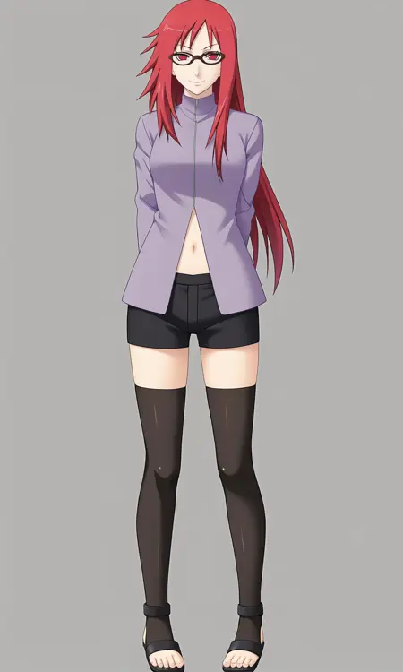 purple shirt, (waist belt), navel, black shorts, black stockings,