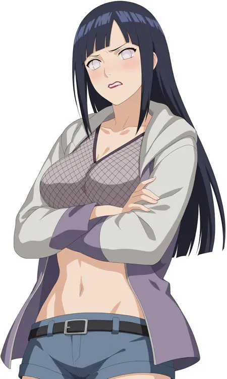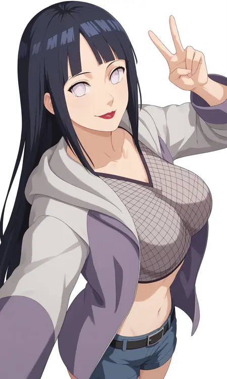 hinatartn、1girl、観察者を見つめる、長い髪、青い髪、短いショーツ、フィッシュネットトップ、大きい胸、紫の目、お腹の部分、赤い唇、胸元、前髪はストレート、オープンなフード付きパーカー