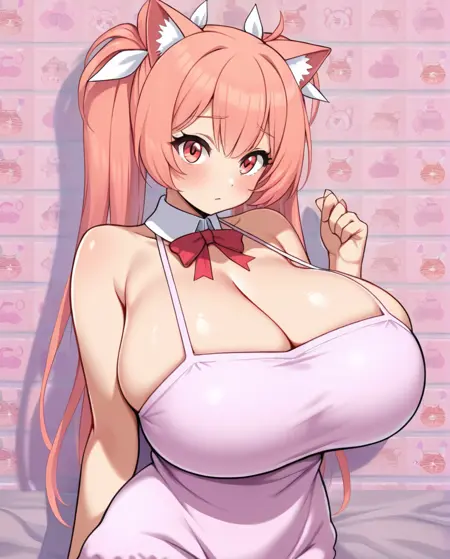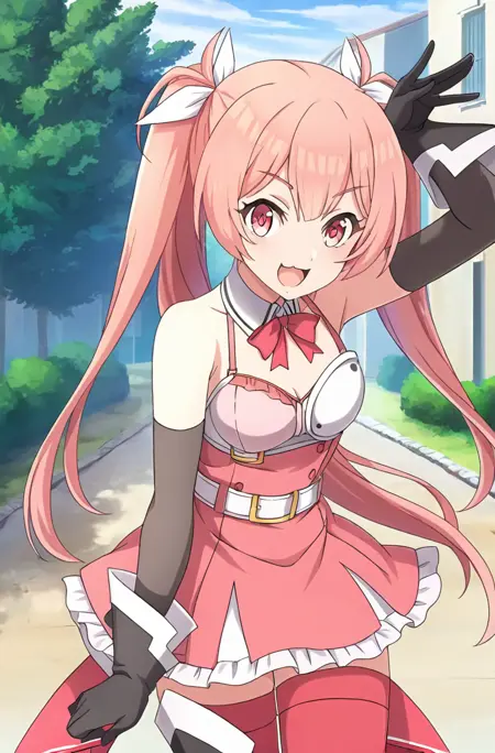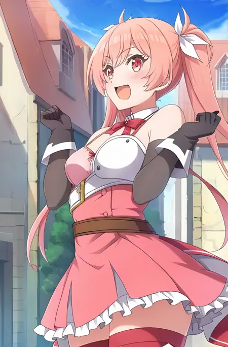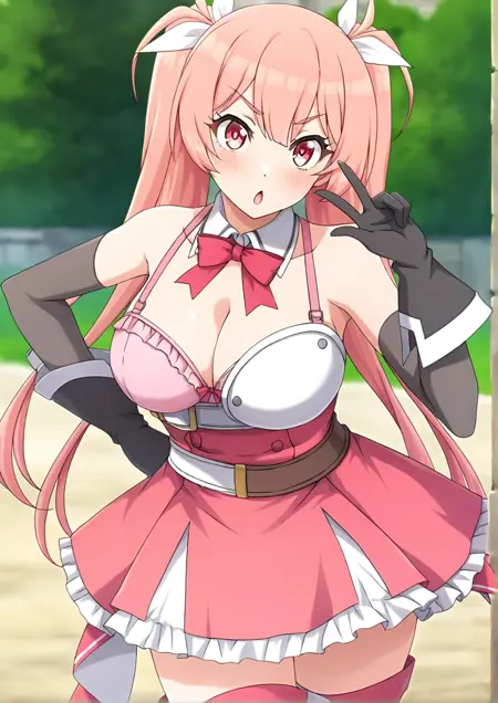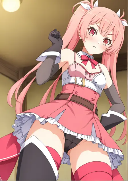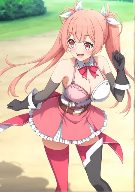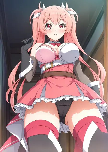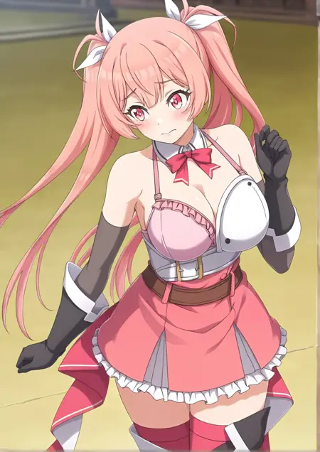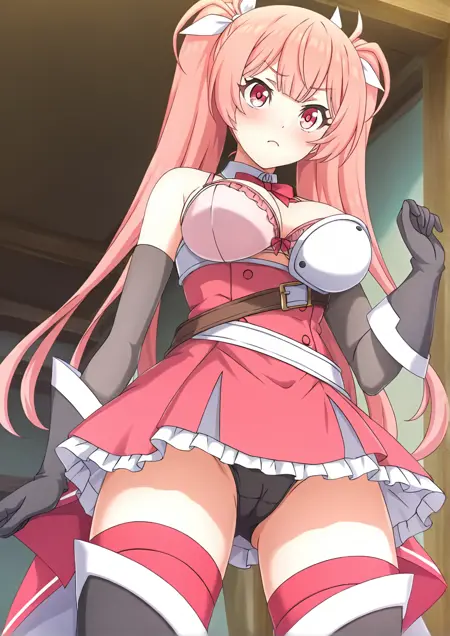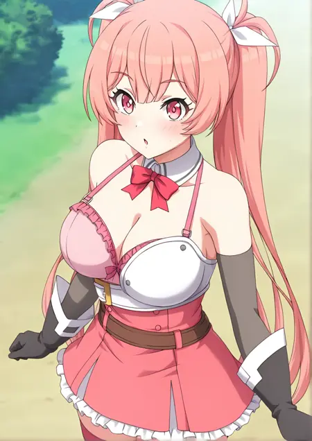 1girl, solo, Erika-Liver020-Wattpad, pink hair, bangs, pink skirt, hair ribbon, frills, pink eyes, thighhighs, white belt, brown belt, bowtie, ribbon, black gloves, twintails, detached sleeves, black sleeves, suspenders, detached collar, long stockings, pink stockings, pink bra, pink skirt, white half-chest armor, single half-chest armor