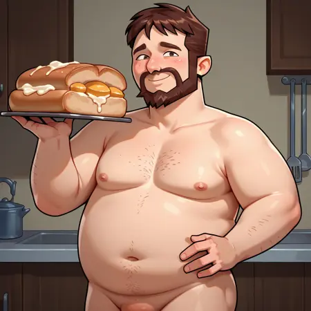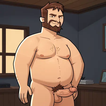 negative prompt: score_6_up, score_5_up, score_4_up, score_3_up, score_2_up, score_1_up, mutiple earrings, stud earrings, bad_ears, ear piercing, muscle, muscular, bara, obliques, belly, pectorals, shota, bad anatomy, worst quality, slim, hip bones, female, woman, pink lips, painted lips, groin, holding, walking, blurry, holding object, ponytail, single hair bun, child, aged down, gnome, full body, extra pockets, big belly, giant,