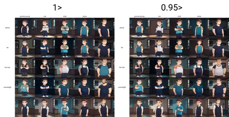 네거티브 프롬프트: muscle, muscular, bara, obese:0.5, big belly, beard,