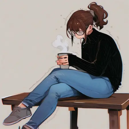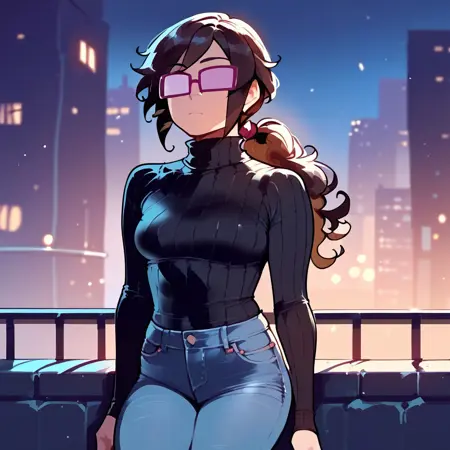 黑色毛衣,高领,牛仔裤,灰色鞋子,马尾辫