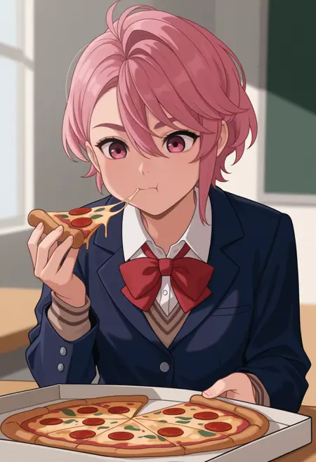 デフォルトの服装: 制服、青いジャケット、ブレザー、長袖、茶色のセーター、白いシャツ、カラー付きシャツ、赤いボウタイ、紫のスカート、プリーツスカート、ミニスカート、白い靴下、ハイソックス