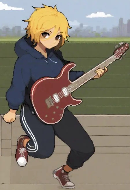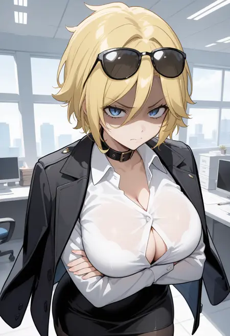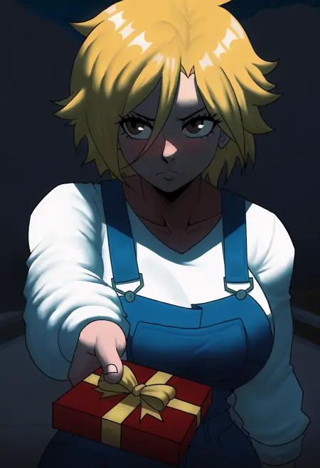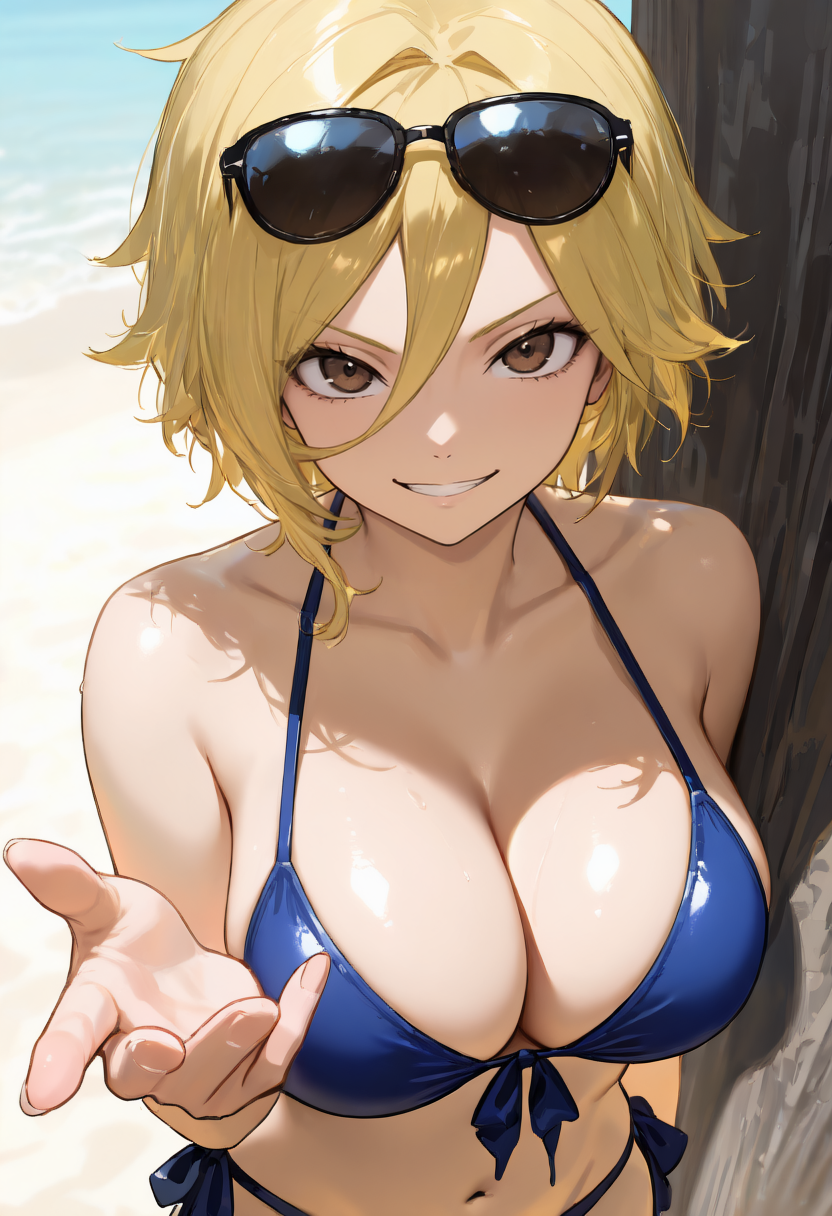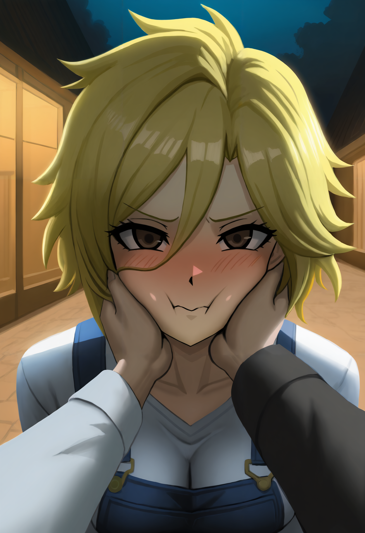 • Appearance tags: brown eyes, bangs, short hair, blonde hair, hair between eyes