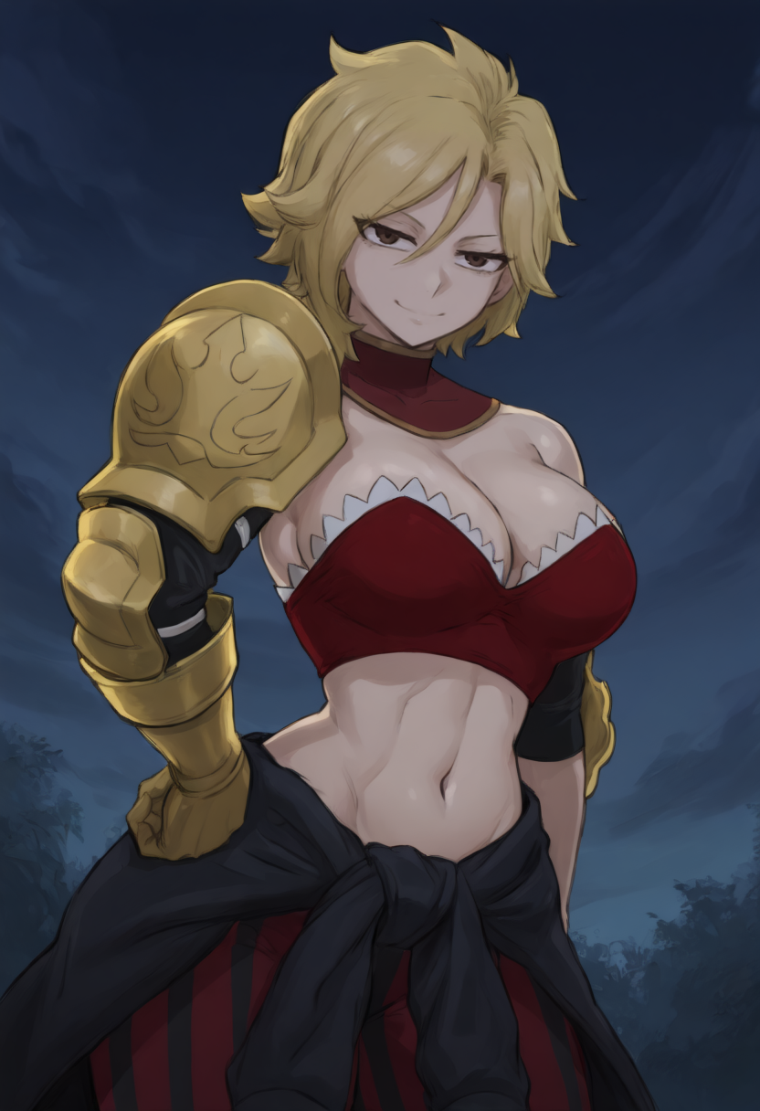 2. Armor: detached collar, red collar, red bandeau, strapless, bare shoulders, cleavage, single pauldron, yellow pauldron, single gauntlet, yellow gauntlet, black clothes around waist, black jacket around waist, black and red striped pants, sandals