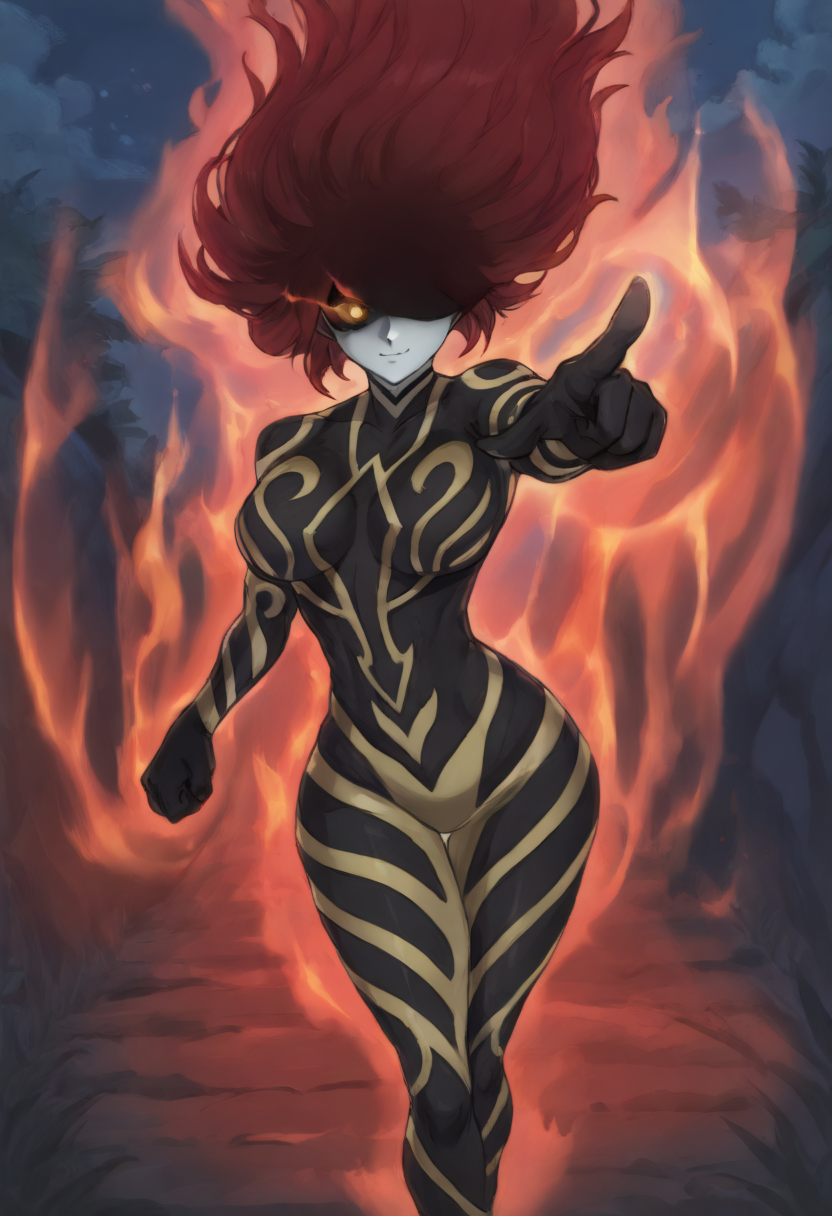 외모 태그: 빛나는, 오라, 떠있는 머리카락, 빛나는 머리카락, 긴 머리, 한쪽 눈, 동공 없음, 빛나는 눈, 네온 트림, 색상이 있는 피부, 검은 피부