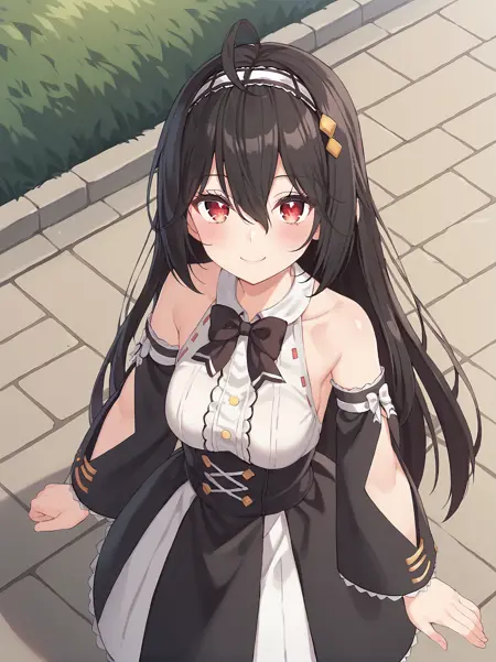 white collar, white shirt, black bowtie, bare shoulders, detached sleeves, black high-waist skirt, black pantyhose, thigh strap, black shoes,