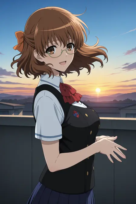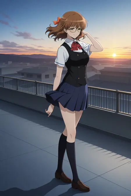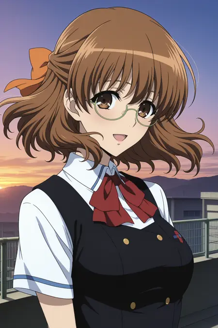 sakuragi yukari, brown hair, short hair, orange hair bow, brown eyes, green-framed eyewear, semi-rimless eyewear, school uniform, short sleeves, black vest, white shirt, collared shirt, red neckerchief, school emblem, blue skirt, pleated skirt, black kneehighs, loafers