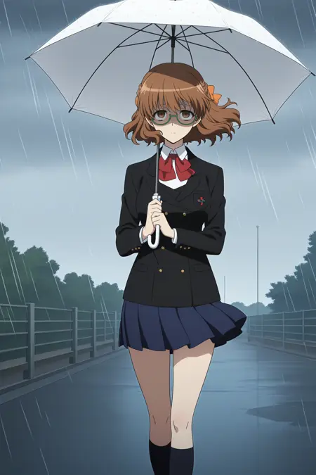 sakuragi yukari, brown hair, short hair, orange hair bow, brown eyes, green-framed eyewear, semi-rimless eyewear, school uniform, blazer, long sleeves, black jacket, white shirt, collared shirt, red neckerchief, school emblem, blue skirt, pleated skirt, black kneehighs, loafers