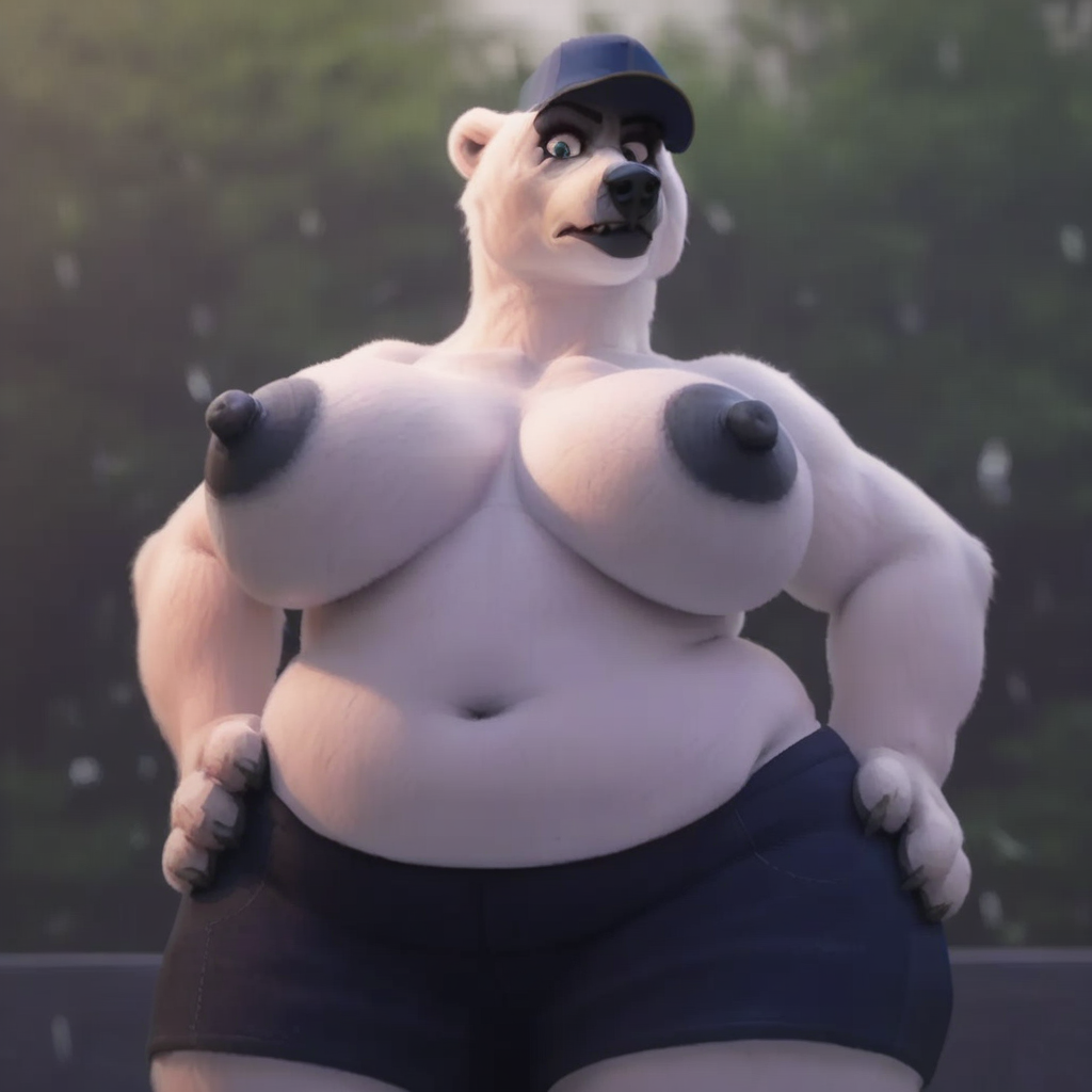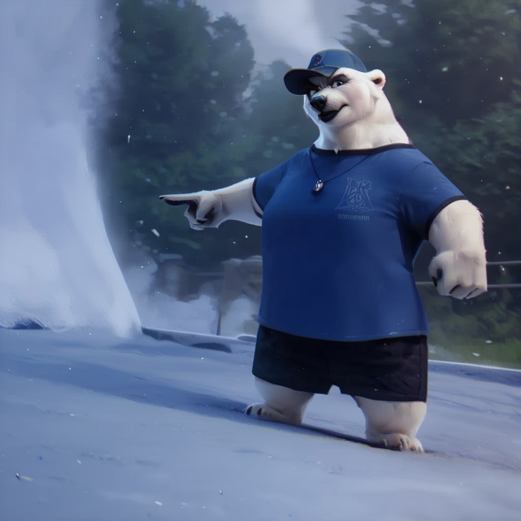 替代提示词:北极熊、拟人化、女性、成熟女性、白色毛发、黑色嘴唇、蓝色眼睛、蓝色棒球帽、蓝色上衣、黑色短裤