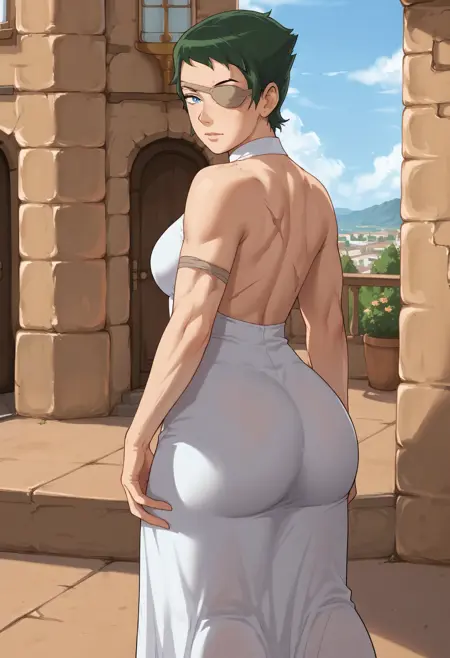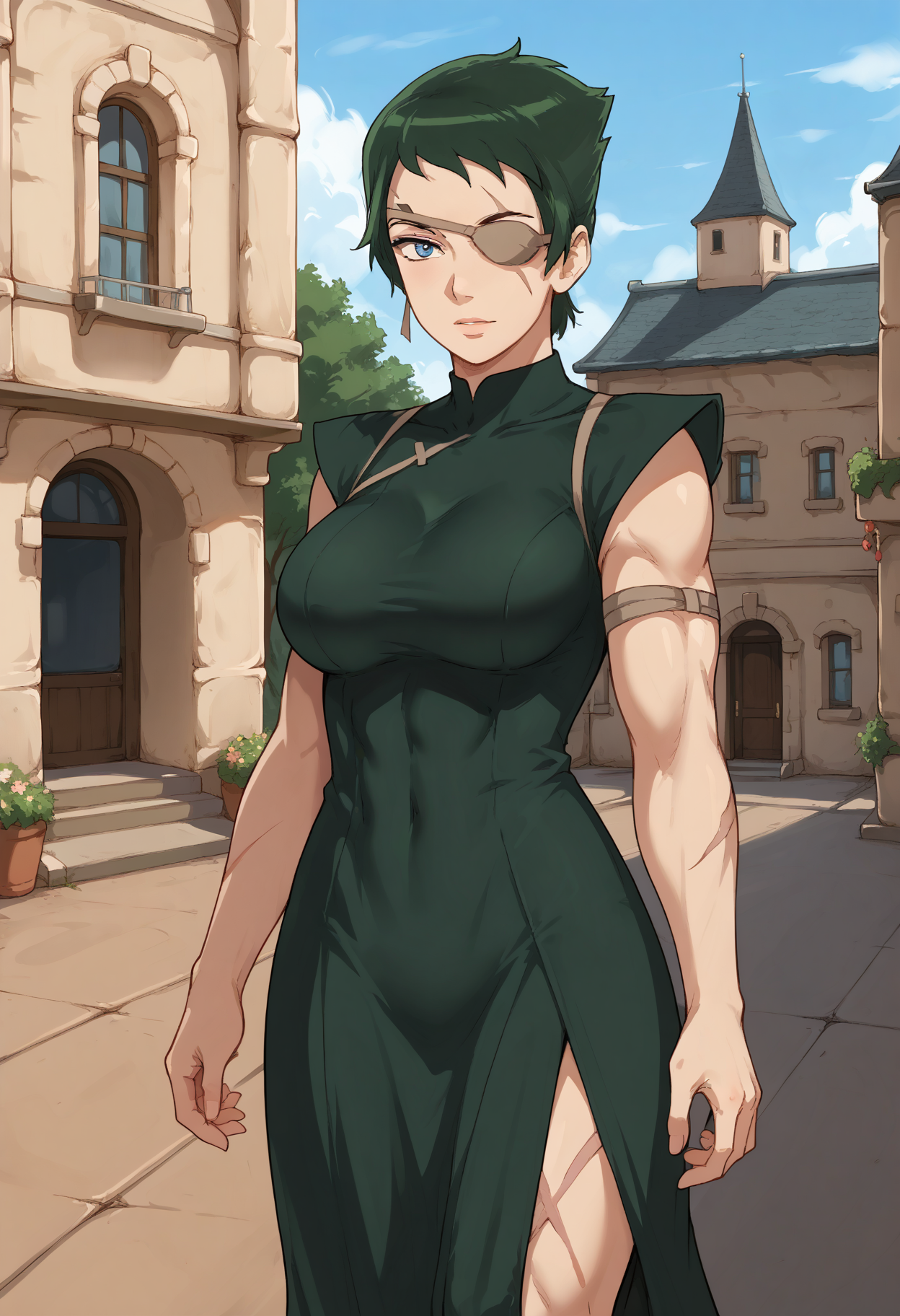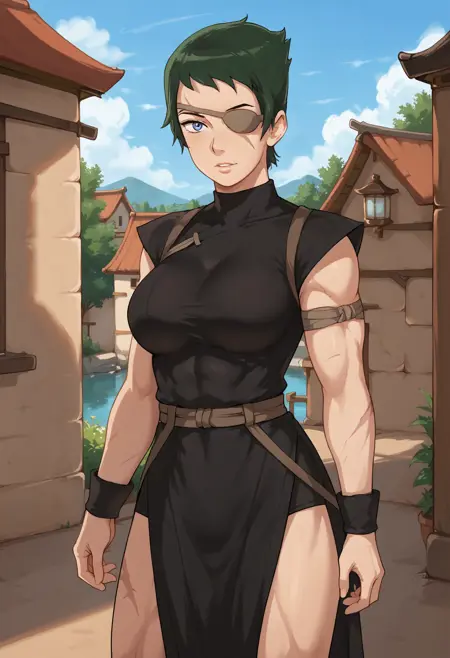 main tags: 1girl, solo, blue eyes, green hair, short hair, muscular female, muscular, abs, scar, breasts, large breasts, thighs,midriff, navel, eyepatch, crop top, armband, shorts, pelvic curtain, ninja