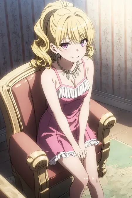 gokusai_kaibi, blonde hair, ponytail, drill hair, purple eyes