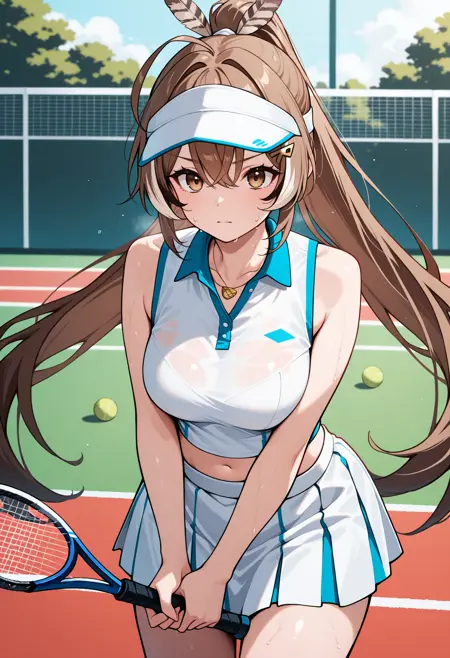 N4nashiSmmr, 棕色眼睛, 棕色头发, 长发, 条纹额发, 天线发, 马尾, 羽毛发圈, 发夹, 多层比基尼, 条纹比基尼, 棕色比基尼, 白色比基尼, 前系带比基尼上衣, 高腰设计, 白色腰带, 蓝色比基尼裙, 棕色腰间蝴蝶结, 大腿环