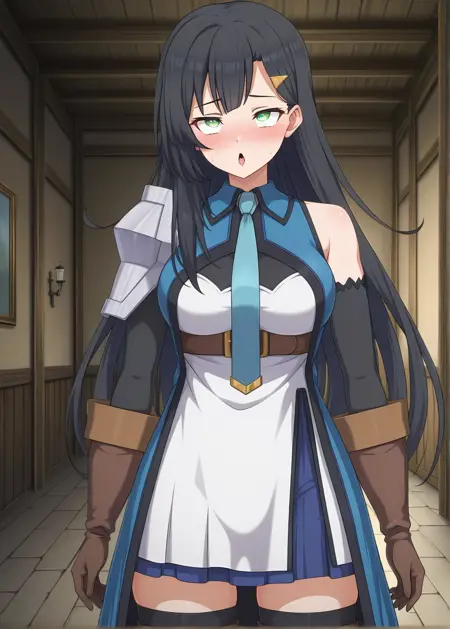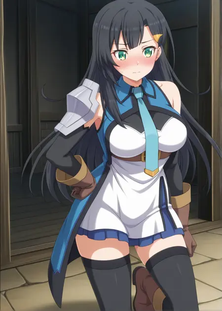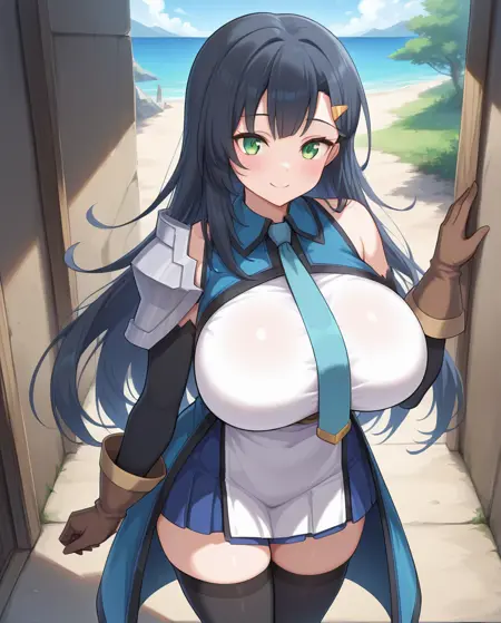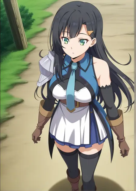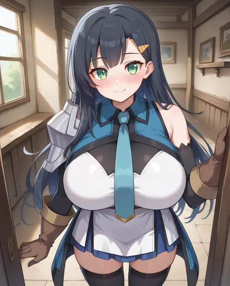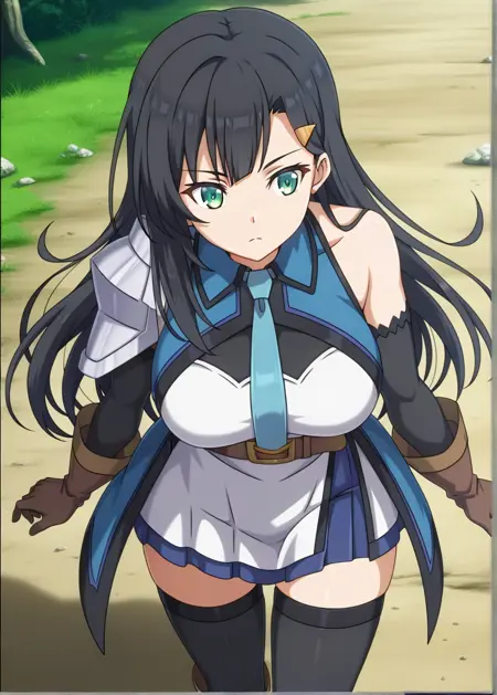 Prompt: 1girl, Lia-Liver020-Wattpad, solo, black hair, long hair, blue tie, necktie, detached sleeves, bangs, green eyes, brown gloves, bare shoulder, brown boots, hair ornament, ornaments, shoulder pad, black stockings, long stockings, white dress, brown belt, blue tunic, blue skirt, thighs