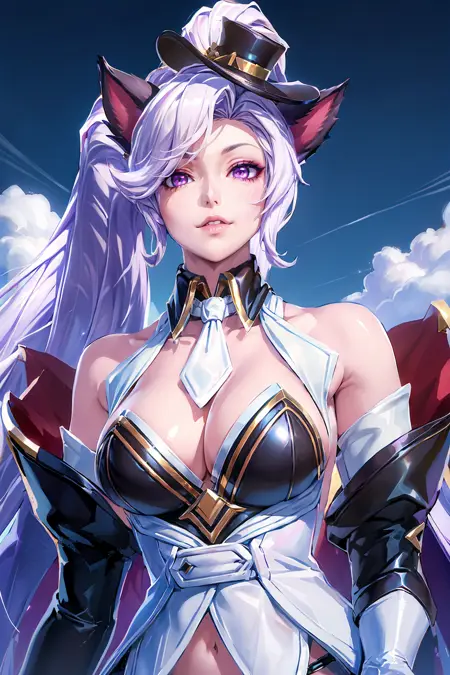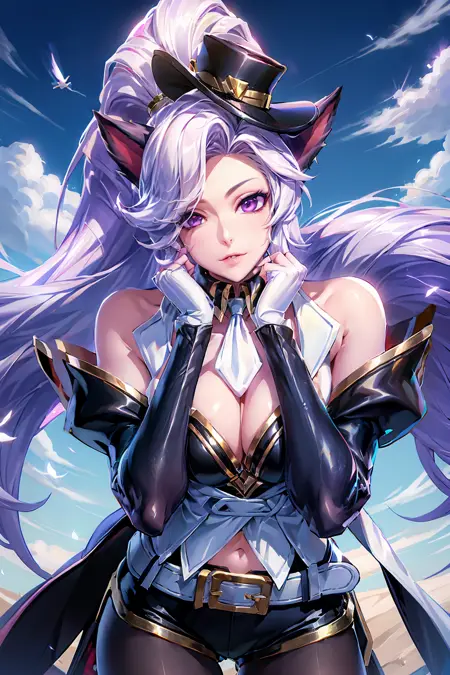 プロンプト: Arum_GFL, 1girl, solo, hat, mini hat, long hair, white hair, ponytail, animal ears, cat ears, looking at viewer, purple eyes, parted lips, closed mouth, bare shoulders, detached collar, necktie, cleavage, breasts, large breasts, gloves, elbow gloves, nail polish, navel, belt, white belt, short shorts, black shorts, legwear under shorts, pantyhose, black pantyhose, black footwear, high heels