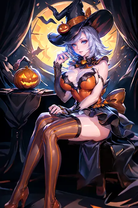 Prompt: Diao_Chan_Halloween, 1girl, solo, long hair, hat, witch hat, witch, blue eyes, makeup, nose, lips, parted lips, bow, orange bow, cleavage, breasts, medium breasts, dress, gloves, nail polish, orange nails, skirt, thighhighs, striped, strapless, striped thighhighs, vertical-striped thighhighs, high heels, halloween, jack-o'-lantern, halloween costume