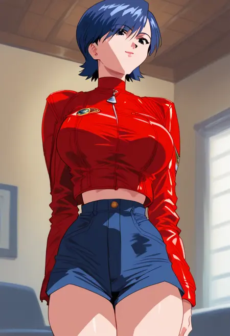 mikiv2, short hair, blue hair female, jewelry, large breasts, red_jacket, croptop, long sleeves, shorts,