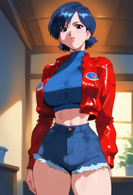 触发词:miki_v,短发,蓝发女性,大乳房,露脐装,肚脐,短款夹克,红色夹克,牛仔短裤,
