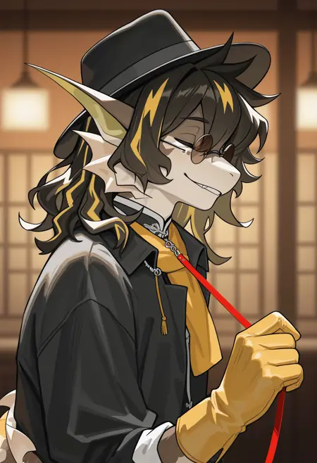 Pony: score_9, score_8_up, score_7_up, score_6_up, score_5_up, score_4_up, Lee, d313c1v3, furry, solo, 1boy, black hair, gloves, smile, round eyewear, hat, multicolored hair, coat, yellow eyes, ...your tags...