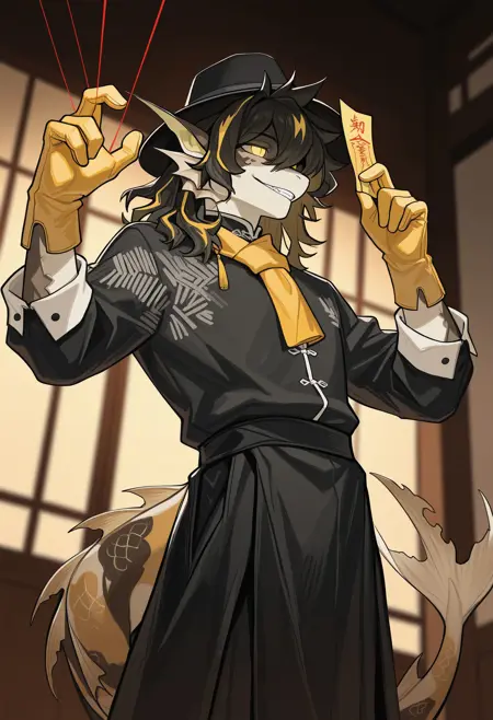 Illustrious: best quality, amazing quality, very aesthetic, absurdres, newest, lee, d313c1v3, solo, furry male, head fins, furry, yellow gloves, round eyewear, hat, coat, multicolored hair, yellow eyes, smile, looking at viewer, ...your tags...