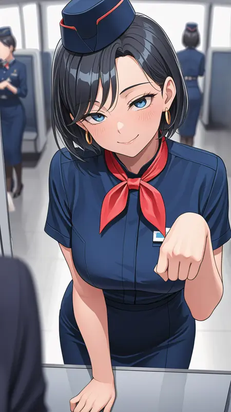 short hair, black hair, blue eyes, loop earrings, yellow top, sleeveless, belt, blue shorts,