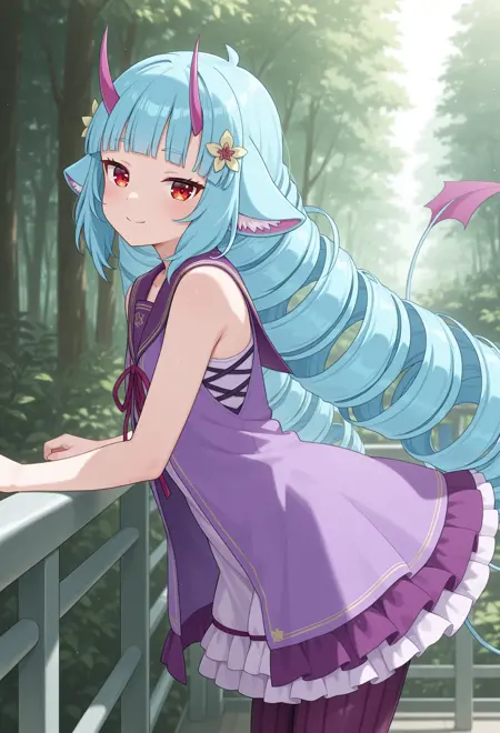 very long hair,drill hair,blue hair,twin_drills,blunt bangs,red eyes,horns,animal ears,hair ornament,tail,