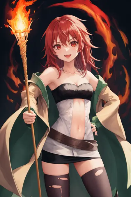 提示词:hiita,裙子,肚脐,破烂衣服,法杖,手持法杖,破烂的过膝袜