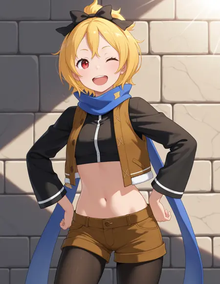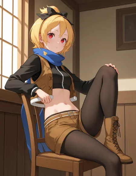 Season 3: cropped jacket, loose sleeves, brown vest, open vest, blue scarf, brown shorts, short shorts, pantyhose under shorts, midriff, cross-laced footwear, brown footwear
