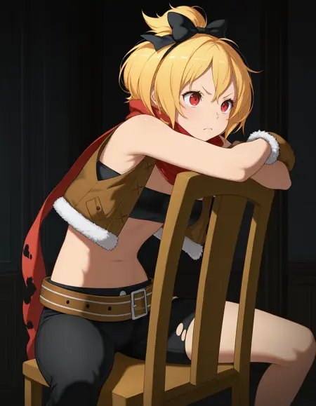 Season 1: open vest, brown vest, midriff, torn pants, torn scarf, single pantsleg, fur-trimmed gloves, ankle ribbon, red scarf, belt, bandeau