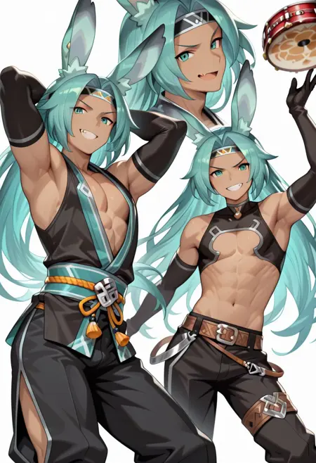 드럼 Luca, 청록색 눈, 청록색 머리카락, 긴 머리, 검은 피부, 토끼 귀, 드럼, 드럼 헤드밴드, 가슴근, 검은 옷, 일본식 옷, 액세서리, 팔꿈치 장갑, 복부 노출, 검은 바지, 절개 바지, 다리 노출