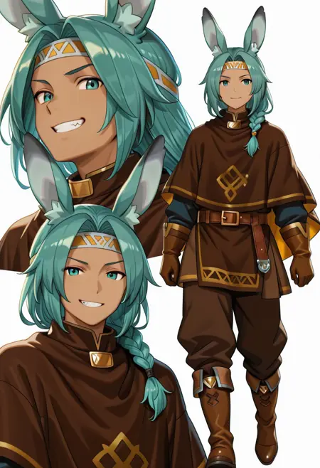 폰초 Luca, 청록색 눈, 청록색 머리카락, 땋은 머리, 검은 피부, 토끼 귀, 폰초, 폰초 헤드밴드, 갈색 옷, 갈색 장갑, 긴 소매, 갈색 바지, 벨트, 캐플렛, 폰초, 부츠