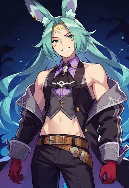 ベースルカ: ターコイズ色の目、ターコイズ色の髪、長い髪、黒い肌、ウサギの耳、ベース、ベースヘアバンド、肩出し、グレーのクロップドトップ、白いロゴ、手袋、肘まで手袋、お腹部分、黒いパンツ、切り替えパンツ、膝の可见、ベルト、グレーとイエローのサロング、ブーツ