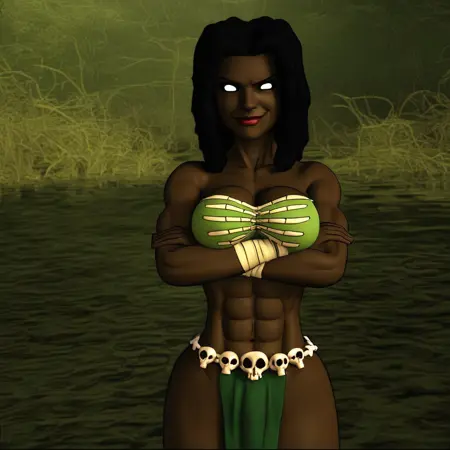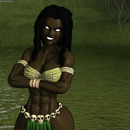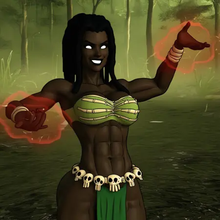 dark skin, ebony, ebony female, 1girl, dark-skinned female, red lips, black hair, long hair, dreadlocks, white eyes, no pupils, green tube top, bone bra, bra of bones, cleavage, skull belt, belt of skulls, wristbands, loin cloth, crotch curtain, green crotch curtain, green loin cloth, toned female, midriff, navel, abs,