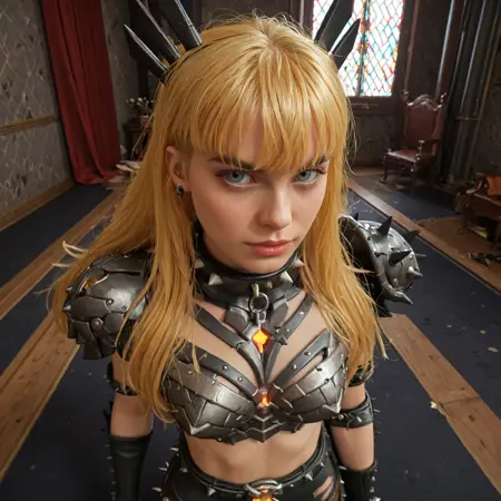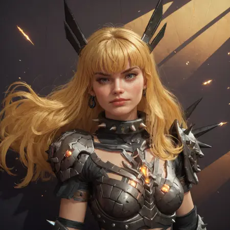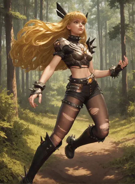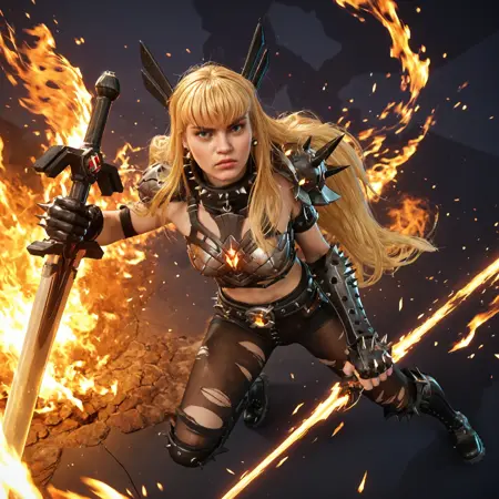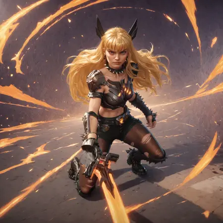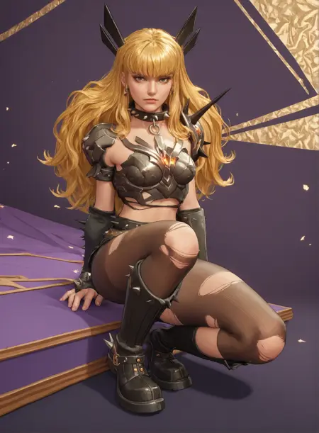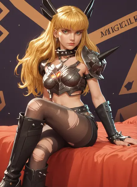 magikrivals,1girl, blonde, long hair, chest armor, torn pantyhose, sword, shorts, fight pose, spiked collar, spiked headband , spiked boots, spiked gloves, bangs, front view