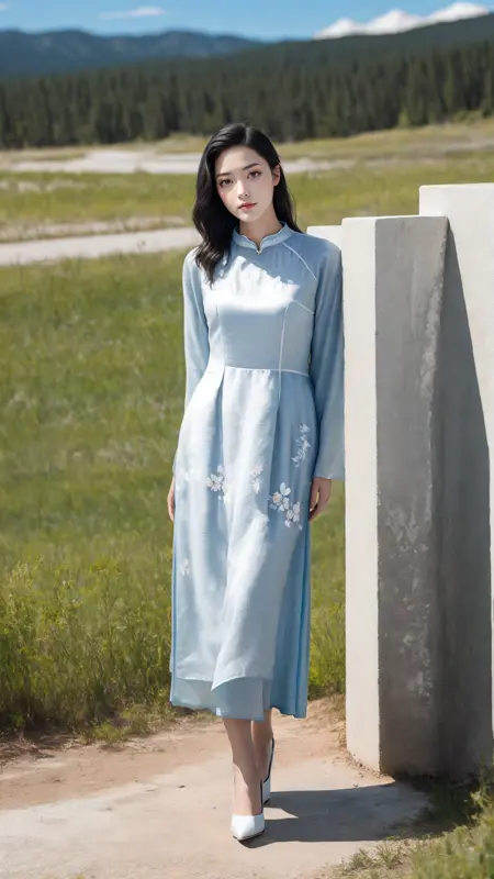 lady, full body, black hair, brown eyes, { long hair | short hair | simple side brad hair }, __*/colors__ aodai, white { shoes | high heels } , earring
