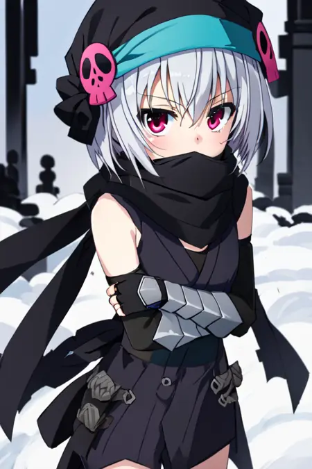 hachisuka goemon, short hair, hat, black scarf, japanese clothes, obi, elbow gloves, fingerless gloves, gauntlets, fishnet pantyhose, boots