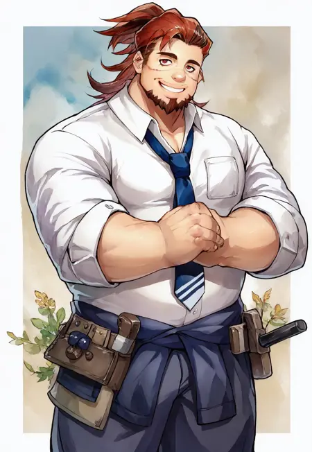 BoogeymanDefaultOutfit, white button-up, blue tie, shirt pocket, rolled-up sleeves, navy blue slacks, navy blue sandals, utility belt
